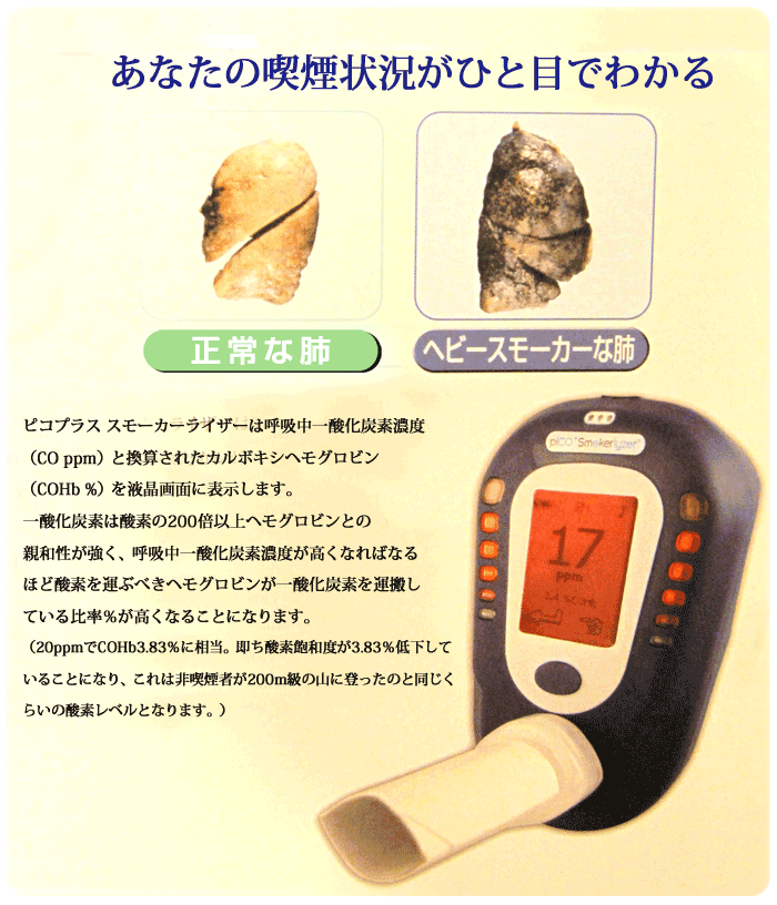 また、呼気中の一酸化炭素(CO)測定で客観的に禁煙状況を確認しながら動機付けを行い、禁煙を成功に導きます(効果には個人差がありますが90%の方で有効です)。